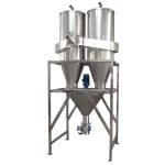 本套旋風(fēng)式粉體輸送系統(tǒng)采用雙旋風(fēng)分離、過(guò)濾二段式料斗通過(guò)專用大口徑氣動(dòng)轉(zhuǎn)換閥(信一專利)切換不間斷輸送粉體,旋風(fēng)料斗出風(fēng)過(guò)濾口采用蜂窩式過(guò)濾袋過(guò)濾后經(jīng)主機(jī)鼓風(fēng)機(jī)抽出 ,再次過(guò)濾后排出,確保車間無(wú)粉塵泄漏。